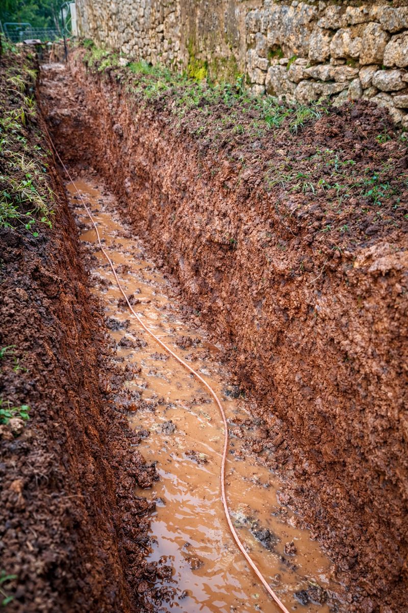 La tranchée visible sur l’image a été creusée à environ un mètre de profondeur. À l’intérieur, un conducteur en cuivre nu de section 25 mm² est posé en ligne droite. Il sera ensuite recouvert, et relié au bornier de terre du tableau électrique. Ce type d’installation, appelé “tranchée horizontale”, est couramment utilisé sur les terrains déjà aménagés, notamment lors de rénovations.